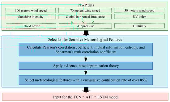 On this basis, the optimized combination confidence scores of the meteorological features are ranked in descending order. Then, NWP features with a cumulative contribution rate exceeding 85% are selected [20], thereby achieving the selection of key meteorological features. And its flowchart is shown in Figure 2.