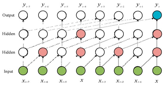 The output power of wind and photovoltaic clusters is a typical complex time-series structure, characterized by long temporal spans. In predicting the output power at each time step, only the power information from previous time steps should be considered. To address this, this paper introduces the Temporal Convolutional Network (TCN), which integrates dilated causal convolution layers and residual connections [21]. In designing the pre-trained network, the TCN layer is first used to extract the wind and solar output features from the source domain. The structure of the dilated causal convolution in TCN is shown in Figure 3, with the dilated convolution calculated as shown in Equation (6) below: