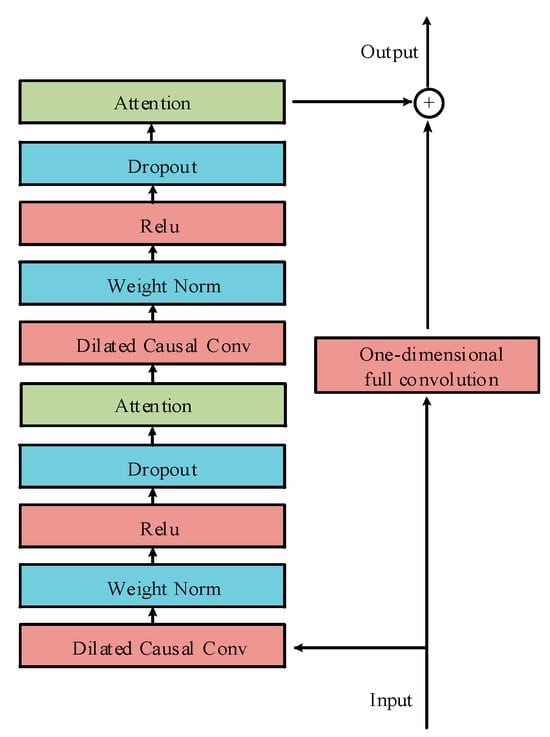 The self-attention mechanism can dynamically learn information between data points to update weights, allowing the model to focus more on important input information and improve predictive performance. To improve the model’s robustness and accelerate convergence, this paper incorporates the attention mechanism into the TCN. The residual unit of the TCN model, enhanced by the attention mechanism, is illustrated in Figure 4.