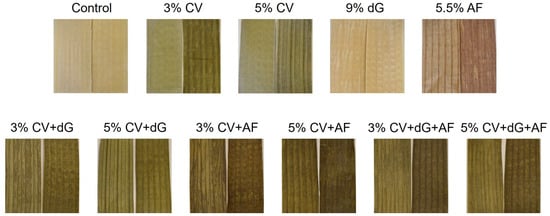 The sample 5% CV + dG + AF was the only sample with a 1% increase in moisture content after drying (Table 2), indicating stronger water binding. The appearance of the dried lasagna sheets is shown in Figure 1. The color changes that could be observed with the eye are also reflected in the measured L*a*b* values (Table 2). While the control and the dG sample did not differ visibly in their appearance and L*a*b* values (ΔE = 0.62), the samples with CV and CV + dG became significantly darker (decreased L* value), greener (decreased a* value), and yellower (increased b* value). Samples with AF, CV + AF and CV + dG + AF became darker (decreased L* value) and redder (increased a* value). In addition, samples with AF and CV + dG + AF were less yellow (decreased b* value). Due to the formation of mixed colors through the combination of ingredients, and with higher CV concentrations, ΔE increased.