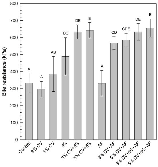 Bite resistance of the pasta in kPa (means ± SD). AF, apple fiber; CV, C. vulgaris; dG, denatured gluten; SD, standard deviation. Different superscript letters indicate groups with significant differences (confidence interval 95%).