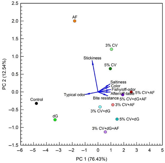 Principal component analysis of the sensory results of trained German panelists. The first two principal components explain 88.97% of the variance. AF, apple fiber; CV, C. vulgaris; dG, denatured gluten.