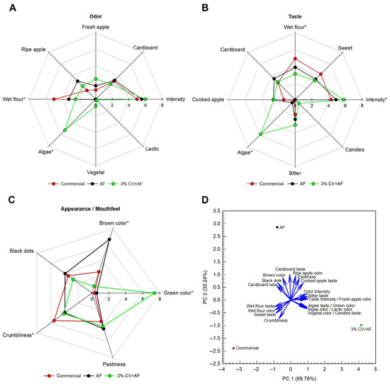 Sensory descriptive attributes of the fusilli claiming to be high fiber (AF) and the microalgae fusilli claiming to be high fiber (3% CV + AF) in comparison with commercial fusilli. (A) Odor profile, (B) taste profile, and (C) appearance and mouthfeel descriptors of cooked pasta evaluated by trained Spanish panelists on a 10-point linear scale. (D) Principal component analysis of the sensory results given by the trained Spanish panelists. The first two principal components explain 100% of the variance. AF, apple fiber; CV, C. vulgaris. Asterisks denote the descriptors for which significant differences were observed.