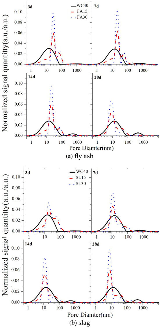 The PSD curves of composite cement pastes are shown in Figure 6. The PSD curves of all the composite cement pastes contain two peaks. Compared to the PSD peaks of neat cement paste, the ones of composite cement pastes are much higher and thinner. In addition, the left peak and right peak of all the composite cement paste PSDs are right next to each other, while the ones of neat cement paste are separated. At the same time, the effect of admixture is significant. The PSDs of each composite cement are markedly different before 14 days, however, the PSDs of the composite cement tend to be similar at 28 days. Compared with the peak of neat cement paste, the addition of fly ash shifts the peaks to the right before 14 days, but shifts the peaks to the left at 28 days. Furthermore, the effect of slag shifts the peaks to the right at 3 days and then shifts the peaks to the left. However, the peaks of paste blended with silica fume are on the left of those of the neat cement paste from the beginning.