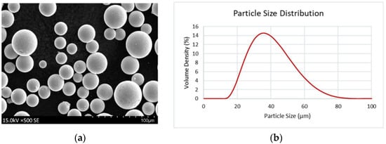 (a) SEM image of representative L-PBF Inconel 718 powder; (b) L-PBF Inconel 718 powder particle size distribution [].