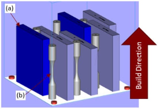 The L-PBF Inconel 718 blanks were printed using standard 50 μm layer thickness process parameters with a nitrogen cover gas on the Concept Laser Series 5 machine, identical to the process parameters used in prior work by Johnson []. Figure 2 shows the material blanks and the additive build plate layout. The material blanks shown in Figure 2 include (a) solid blocks and (b) vertical as-printed specimens. Six fully machined specimens can be produced out of each solid block.
