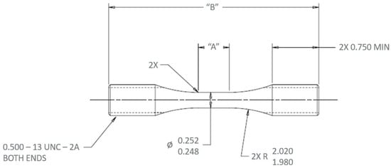 Fatigue specimen geometry with dimensions in inches. Gauge length “A” was set at 0.750 in (dimensions are in inches; 1 in = 24.5 mm).