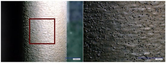 Surface roughness analysis was performed on the as-printed surfaces of the fatigue specimens. Figure 5 shows representative images of the as-printed surfaces. Figure 5 displays the outer diameter surface of the as-printed specimen at 30× and 100× magnifications, respectively. The surface roughness of the as-built gauge diameters was nondestructively evaluated using a VHX 6000 digital microscope produced by Keyence Corporation, Osaka, Japan. Average Ra values of the specimens measured 5.3 μm, average Rz values measured 26.7 μm, and average Rv measured 10.8 μm.