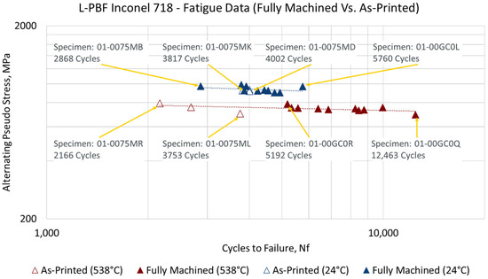 During the low-cycle fatigue testing of the L-PBF Inconel 718, cycles were counted until failure occurred. Each specimen’s fatigue life (Nf) and associated alternating pseudo-stress values, Δσ = E × Δε, were plotted on the fatigue life curves shown in Figure 6. The fatigue curves indicate that room-temperature specimens exhibited minimal differences in fatigue life between the fully machined and as-printed conditions. However, at 538 °C (1000 °F), a more significant difference was observed, with fully machined specimens demonstrating better fatigue performance compared to as-printed specimens. Additionally, it was noted that the fatigue performance at 24 °C (75 °F) was roughly 200 MPa higher than the fatigue performance at 538 °C (1000 °F).