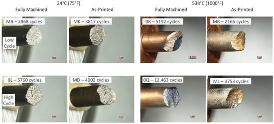 The number of crack initiation sites is summarized in Table 5 below. The 538 °C (1000 °F) as-printed surface specimens had a 2× to 6× larger number of crack initiation sites in comparison to the fully machined specimens. Meanwhile, the 24 °C (75 °F) as-printed surface specimens had a similar number of crack initiation sites in comparison to the fully machined specimens. As expected, with a larger number of crack initiation sites, the 538 °C (1000 °F) condition specimens showed a larger knockdown in fatigue life due to surface conditions in comparison to the 24 °C (75 °F) test-condition specimens. The 24 °C (75 °F) condition had an average 9.4% knockdown while the 538 °C (1000 °F) test condition had an average 66.5% knockdown.