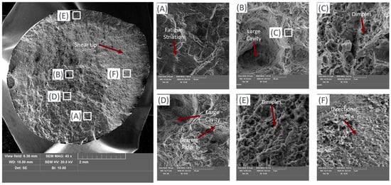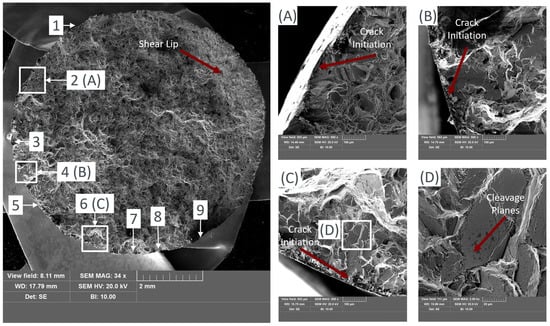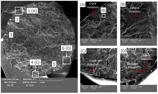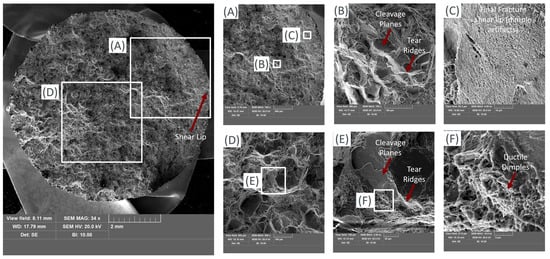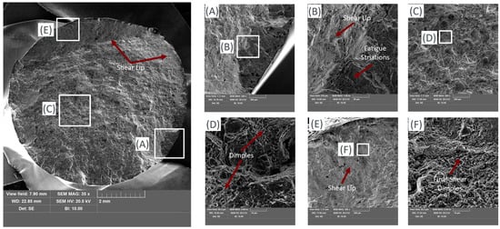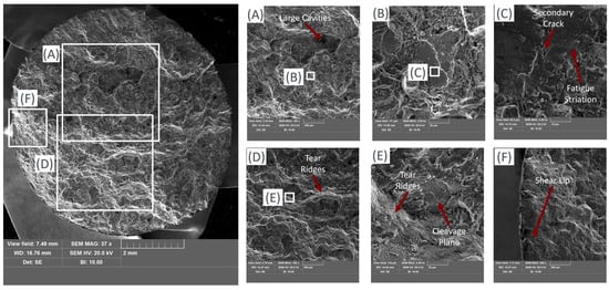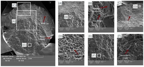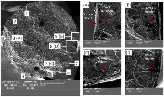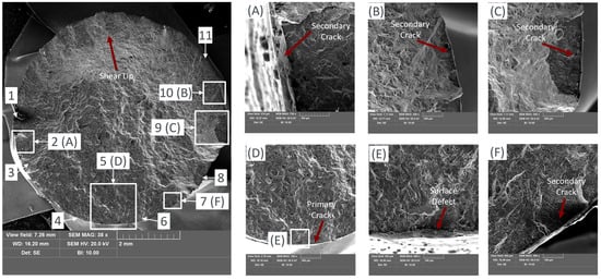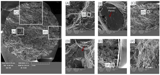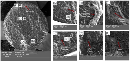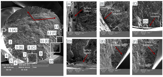 Figure 14 and Figure 15 display representative images of crack initiation sites for the 538 °C (1000 °F) as-printed specimens MR and ML. It is shown that specimen MR had a total of 12 initiation sites while specimen ML had 11 initiation sites. It was noted that both Figure 14 and Figure 15 show evidence of surface defects causing the initiation of the as-printed surface specimen’s cracks. It was noted that the defect sizes in Figure 14A,D are both roughly 50 μm deep, and the defect size in Figure 15E is roughly 25 μm deep, similar to the defect size noted in Figure 10A. Additionally, there is evidence of cleavage planes at the crack initiation sites and a relatively large shear lip at the final fracture locations.