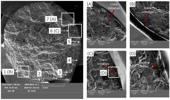 Figure 10 and Figure 11 display representative images of crack initiation sites for the 24 °C (75 °F) as-printed specimens MK and MD. It is shown that specimen MK had a total of nine initiation sites while specimen MD had seven initiation sites. Both specimens MK and MD were tested under the same conditions as specimens MB and 0L; however, specimens MK and MD were tested in the as-printed surface conditions. It is shown in Figure 10 and Figure 11 that specimen MK and MD crack initiation sites tended to occur at surface defects, Ssuch as in Figure 10A and Figure 11D. Although specimens MK and MD had additional surface defects compared to MB and 0L, the as-printed specimens had a similar number of crack initiation sites and similar fatigue life compared to the fully machined specimens. As shown in Figure 10A and Figure 11D, the defect sizes on the as-printed surfaces are roughly 25 μm deep.