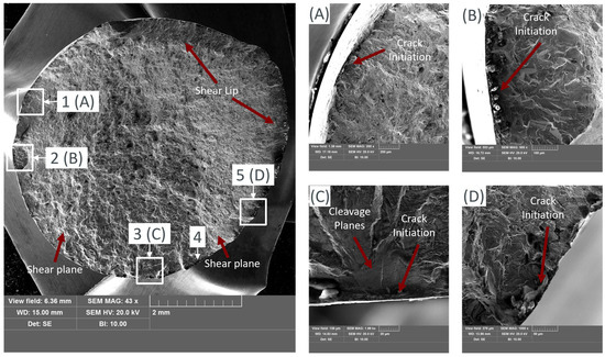 Crack initiation sites for all specimens were documented and are evaluated within this section. It was noted that all crack initiation sites occurred at the surface of the specimen regardless of test temperature and specimen surface condition. Figure 8 and Figure 9 display representative images of crack initiation sites for the 24 °C (75 °F) fully machined specimens MB and 0L. It is shown that specimen MB had a total of nine initiation sites while specimen 0L had six initiation sites. From Figure 8, it can be seen that specimen MB’s crack initiation sites occurred opposite the shear lip. It can also be noted in Figure 8D that the cracks were initiated via cleavage planes.