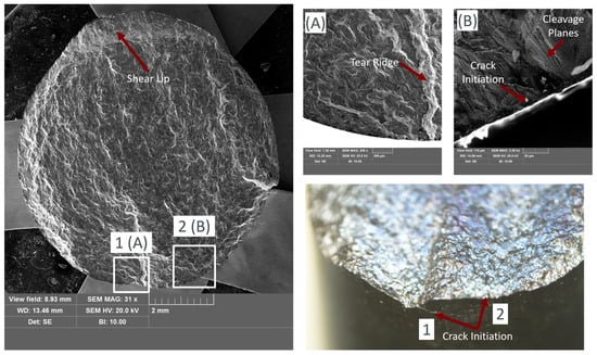 Specimen 0L had a fatigue life of 5760 cycles and was tested at the same condition as specimen MB, which had a fatigue life of 2868 cycles. Similar to specimen MB, specimen 0L’s crack initiation site occurred due to cleavage plane initiations as shown in Figure 9D.