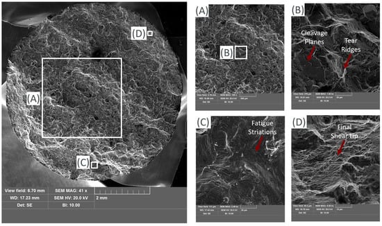 Figure 21 shows the crack propagation of specimen 0Q, which had the longest life out of all the specimens. It shows how the two crack initiation sites connected to each other to create one large crack via a tear ridge as seen in Figure 21A,B. The crack then propagated through the material with a combination of traditional fatigue striations and ductile tearing until the final fracture was initiated along a shear lip.