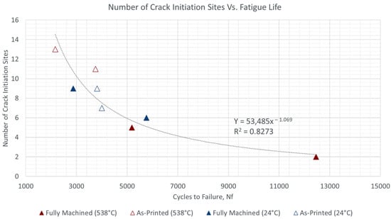 The number of crack initiation sites for each specimen was plotted against the specimens’ resulting fatigue life in Figure 24. A power law function was fitted to the resulting data and is displayed in the graph. It shows that as the number of crack initiation sites increases, the resulting fatigue performance decreases. The highest-performing fatigue specimen (specimen 0Q) had 12,463 cycles to failure and only exhibited 2 crack initiation sites, while the lowest-performing fatigue specimen (MR) had 13 crack initiation sites.