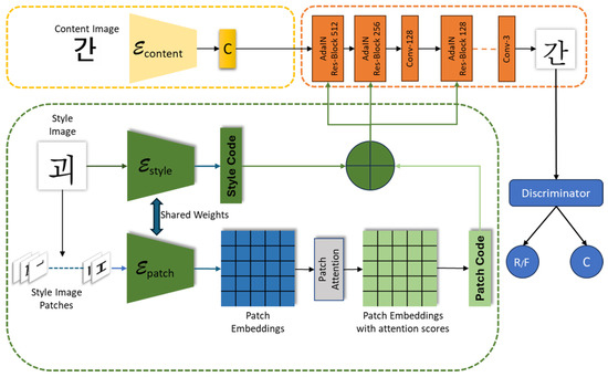 Figure 1 shows the architecture of the model. Our model consists of a typical generator and a discriminator. The generator comprises three parts that work jointly to generate font images, as shown in Figure 1. The first part is a content encoder, which conditions the model to generate images with specific content. The second part is an attention based multitask style encoder used to disentangle style from style images at both global and local style levels. Third, we have a multi-layer Adaptive Instance Normalization-based decoder that takes character content code and style code. The decoder’s input style code is the concatenated representation of global style embedding and patch-based attention applied to patches of style images. Importantly, we used Adaptive Instance Normalization (AdaIN) [24,25] in the decoder to effectively inject the style code for generating font images. Lastly, a multitask discriminator not only predicts between real and fake images but also classifies the content and style of generated images based on target images.