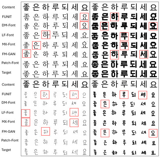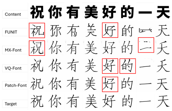 Font design is essential in many scenarios, including logo designs, branding, multilingual typography, handwriting imitation, augmented reality (AR), virtual reality (VR) overlays, and assistive technologies. However, creating a complete font for scripts with large character sets (e.g., Korean, Chinese) can be highly labor-intensive and costly, requiring designers to manually craft each glyph. Typically, the designer starts with a few hundred Chinese or Korean characters that have the most components, and the rest of the components can be mixed and created by mixing and combining based on the target characters. It still remains a time-consuming and labor-intensive task. Due to the high production costs of fonts for these languages, numerous automatic few-shot font generation (FFG) methods [1,2,3,4,5,6,7,8] have been presented recently due to advancements in deep learning techniques. These models have been developed by utilizing Convolutional Neural Networks (CNNs) [9,10,11], Generative Adversarial Networks (GANs) [12,13,14], image-to-image (I2I) [15,16,17,18,19] and Transformers [20,21]. By using only a few characters as sample images, these FFGs aim to generate entire fonts with the same style as sample images. The conventional FFG approach adheres to the paradigm of disentangling and combining style and content images. It can either utilize a global representation of style or a component-wise representation of style. In font styles, a global representation may encompass principal characteristics such as font weight, family type, and size attributes that define the font’s general appearance. For example, in image style transfer, the conventional approach may use a global representation of style by directly matching the statistics of the entire image, such as mean and covariance. On the other hand, the component-wise approach, which focuses on local styles, decomposes each reference sample that shares the same font into predefined components and radicals. This method allows for more fine-grained control over the style elements, as each component (like stroke thickness, serif details, or curvature of letterforms) can be adjusted individually. However, it requires a prior knowledge of the components and radicals, which may limit its applicability to specific domains or styles. Additionally, each character must be manually associated with a particular set of components, necessitating more preparation when applying for new scripts.
