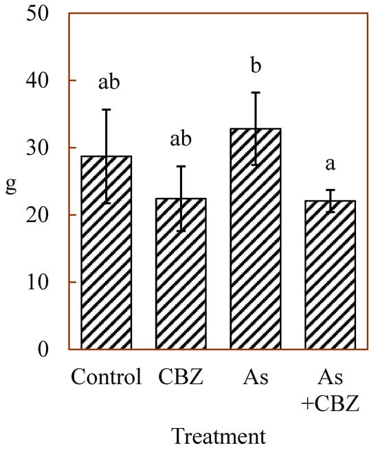 No significant differences (p > 0.05) were found between the final median body weights of the control group and those of all the other experimental groups. This suggests that the As and CBZ exposure levels used in this study had negligible harmful effects on the overall body weight conditions of the animals (Figure 1). However, the final median body weight of the As group was significantly greater than that of the As + CBZ group. This can be explained by the notably greater initial median body weight of the As group than the As +CBZ group before the beginning of the experiment.