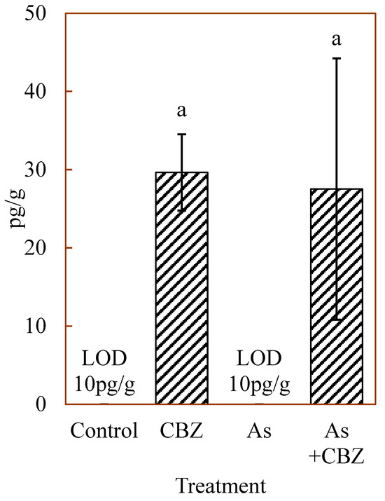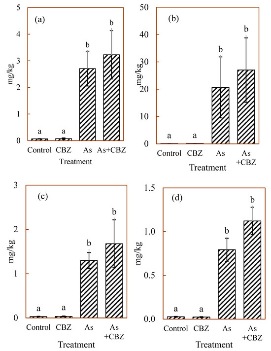 On the other hand, significantly, the CBZ and As + CBZ groups documented CBZ concentrations above the detection limit. This indicates that CBZ exposure at environmentally relevant concentrations has the potential to accumulate within the liver of the model mammals, even though the observed concentration levels were very low. From the literature, CBZ accumulation in the liver induces the expression of CYP3A4 enzymes, with the predominant metabolic pathway being the formation of CBZ-10-11-epoxide as the primary metabolite, which is then followed by hydroxylation to CBZ-10,11-trans-dihydroxy [91,93]. There were minor quantities of the primary metabolite, specifically CBZ 10, 11-epoxide detected, but very close to the limit of detection; thus, they were not considered in subsequent evaluations. Since the quantities of the primary metabolite of CBZ were close to the detection limit, we speculate that the concentration levels may not be enough to have triggered the increased expression of CYP3A4 enzymes. Therefore, the metabolisation of CBZ in this study cannot be ascertained. However, long-term exposure beyond that of this study may be conducted in the future to test if the bioavailable levels can induce the enzymatic process leading to CBZ metabolisation. These results also indicate that the very high exposure dose of As in the As + CBZ group did not interact with CBZ to enhance the concentrations of the pharmaceutical.