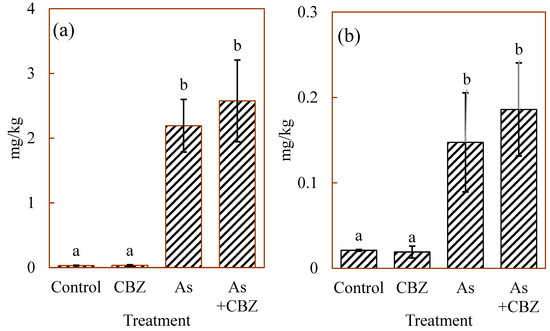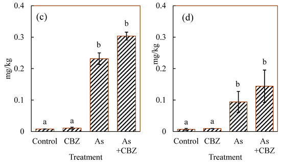 Arsenic, as a redox-sensitive element, is present primarily in soils as As(V) in aerobic conditions, while it is predominantly present as As(III) under anaerobic conditions. It is also known that the presence of As in organic forms is mainly DMA(V) and MMA(V) in the soils [69,70]. In the scientific literature, the cellular intake of different As species is known to be facilitated by phosphate transporters, aquaglyceroporins, facilitative glucose transporters, and organic anion-transporting polypeptides [71]. From the data of the current research, CBZ’s potential influence on enhanced intake of As only occurred at very high As doses. However, the mechanisms of this pharmaceutical on any of these cellular As transporters to enhance As intake were not investigated in this study and are subject to future research.