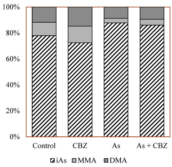 In this study, the As and As + CBZ groups recorded comparably enhanced % iAs and similarly low and comparable % MMA and %DMA, implying an accumulation of unmetabolised inorganic As species, especially As(III), and exhibited low primary and secondary methylation capacities, which we speculate could be partly due to the saturation of As3MT and inhibition by the high concentration of As(III). However, the CBZ group exhibited less % iAs and higher % MMA and % DMA than even the control group. The modulating role of CBZ on As3MT activity cannot be ascertained since it was not part of the investigation in this study.
