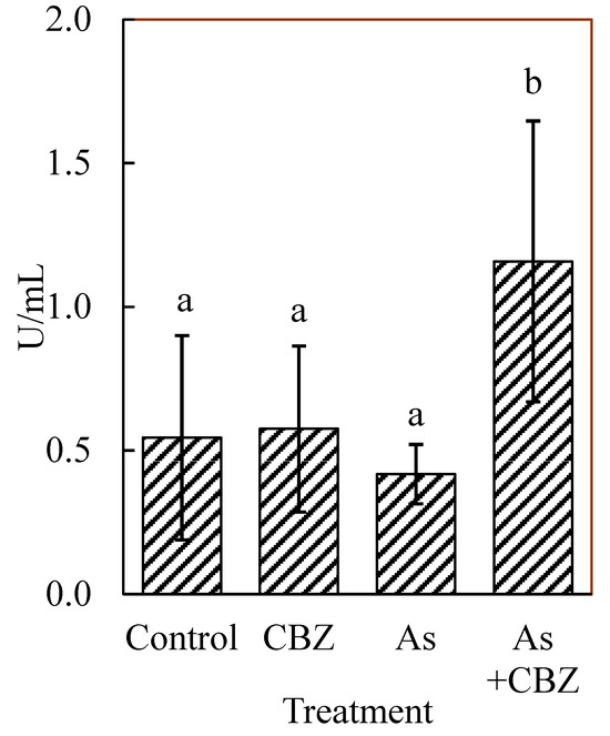A reduction in GPx activity, as observed in the As group, could be caused by rapid adaptation leading to a reduction in the concentration of the enzyme substrate (reduced glutathione). Under such circumstances, there are two probable situations occurring: (a) an increase in the level of peroxides may ensue and cause oxidative stress to the animals in this group, or (b) the decrease in the enzyme substrate can lead to a corresponding reduction in H2O2 levels to curtail or offset oxidative stress conditions [99,100]. These findings remain questionable and need to be elucidated in future research. Regarding the As + CBZ group, which exhibited the highest GPx activity at the termination of the experiment, we anticipate that this may be due to ongoing adaptation to curtail or offset oxidative stress-induced damage, suggesting that the animals in this group were experiencing oxidative stress at the time the experiment ended.