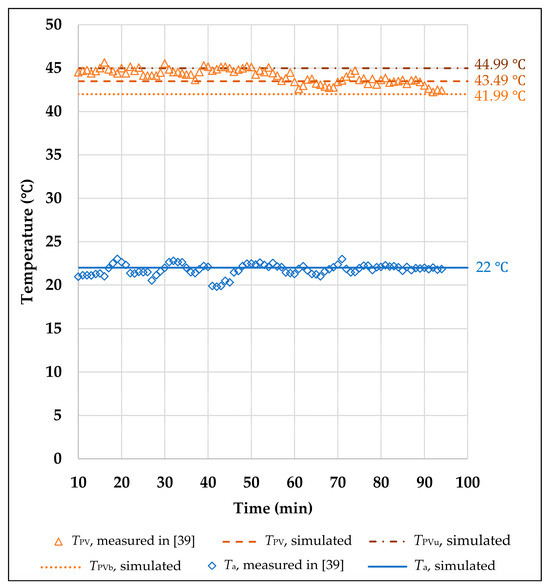 First of all, the proposed model is validated using experimental data and simulated results from [39]. Two simulation exercises are organized according to the description of the used experimentation [39]. The solar chimney model for cooling one PV module of type BP SX320P was made using a wooden channel that was thermally insulated from the surroundings. BP SX320P is a 20 W module with standard polycrystalline PV cells that can be used efficiently in any climate [45]. The experimental circuit consisted of three sections, as described in Section 2. Two identical PV modules were used in this experimental circuit. The first PV module was mounted on the inclined section of the solar chimney just below the absorber, while the second one was mounted on a separate steel frame next to the solar chimney created. This was carried out to maintain the uniformity of the experimental results for the purpose of comparing them to each other. The experimental circuit was tested on 20 October 2010 in Melbourne (Australia) at 37°47″ south latitude, which roughly corresponds to the northern latitudes where Serbia is located. For this reason, the experiments with PV modules inclined at an angle of 37° relative to the horizontal are considered. The temperatures of the ambient air and the bottom surfaces of the PV modules with and without the solar chimney were measured with type K thermocouples. These thermocouples are connected to the Data Taker–DT800 for recording and storing data. During the 90 min test, the maximum solar irradiance was 1000 W/m2, and there was no wind. The ambient air temperature was around 22 °C. The average difference between temperatures of the bottom surfaces of the PV modules with and without the solar chimney was approximately 7 °C.