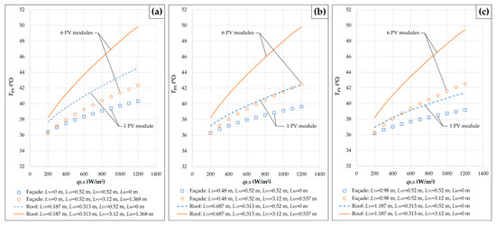 Figure 4 illustrates the dependence of the average temperature of the PV section on the solar irradiance for the PV sections that consisted of 1 and 6 PV modules and the solar chimney heights of (a) 0.5 m; (b) 1 m; and (c) 1.5 m. The PV sections with one and six PV modules have the lengths of 0.52 m and 3.12 m, respectively. The labels “Roof” and “Façade”, as well as the marks of the curves, have the same meanings as in the case of Figure 3.