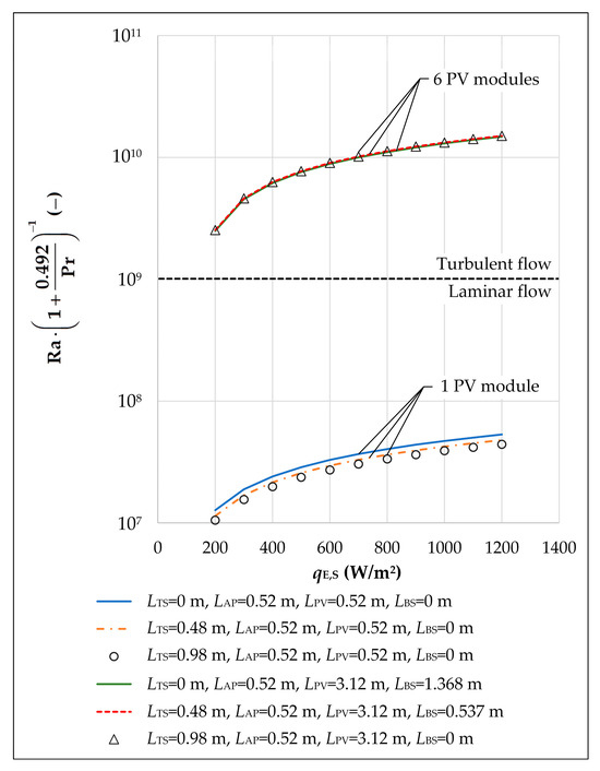 In connection with the results shown in Figure 3 and Figure 4, it is interesting to establish the flow types of free convection from the upper surfaces of the PV section and the acrylic plate. This can best be established based on the value of the fundamental dimensionless number for free convection. Accordingly, Figure 5 presents the dependence of the fundamental dimensionless number for free convection on the solar irradiance for the PV sections with the lengths 0.52 m (consisting of one PV module) and 3.12 m (consisting of six PV modules) and the solar chimney heights 0.5 m, 1 m, and 1.5 m. In Figure 5, the solid blue line, dash–dot red line, and black circles correspond with the PV section consisted of 1 PV module, and the solid green line, dashed red line and black triangles correspond with the PV section that consisted of six PV modules.
