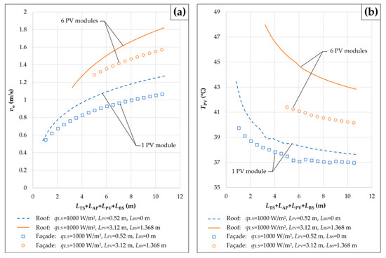 (a) The velocity of the air at the outlet of the solar chimney and (b) the average temperature of the PV section depending on the height difference between the two openings of the ventilation channel for two different numbers of PV modules. Note: For the case of PV modules integrated into the roof, the dimension represents the sum of the projections of the corresponding individual lengths , , , and .