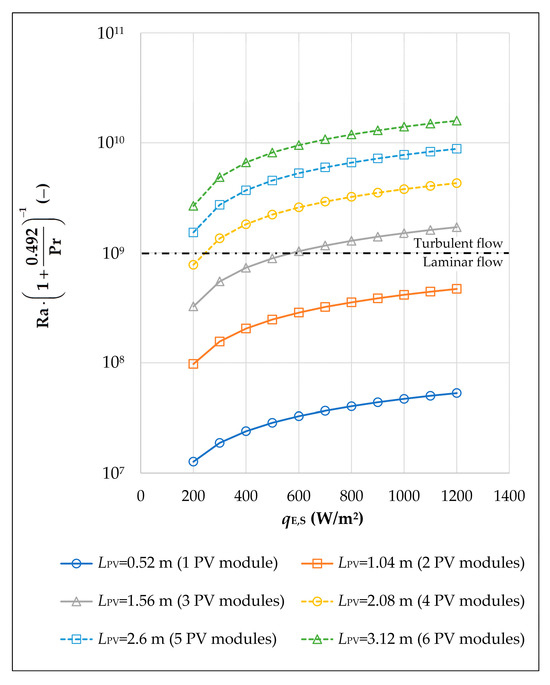 According to Figure 5, the fundamental dimensionless number for free convection is lower than 109 for the PV section that consisted of one PV module, which corresponds to laminar flow. In addition, this dimensionless number is greater than 109 for the PV section that consisted of six PV modules, which corresponds to turbulent flow. In particular, turbulent flow corresponds to higher values of the air velocity in accordance with Figure 3, as well as higher values of the average temperature of the PV section in accordance with Figure 4. This is also confirmation that the proposed correlation (14) was used for the calculation during the iteration procedure.
