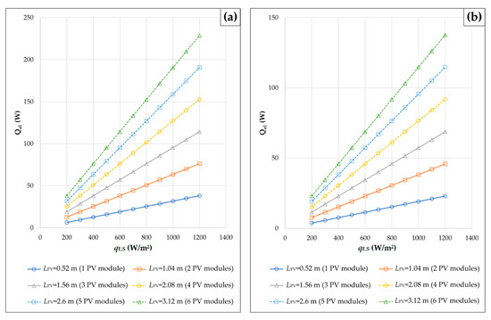According to Figure 8a,b, linear dependences of the PV section power on the solar irradiance are obtained for all the cases of the roof- and façade-integrated PV sections cooled by the solar chimney. As could be expected, the PV section power increases with an increase in the solar irradiance , as well as with an increase in the number of PV modules per section. Since the solar irradiance decreases from 1000 W/m2 to 601.815 W/m2 with an increase in the inclination angle from 37° to 90°, this means that the design with façade-integrated PV modules will have a lower power compared to the corresponding design with roof-integrated PV modules. For the considered angles of inclination, this reduction amounts to 39.82% and corresponds to the reduction in the solar irradiance .