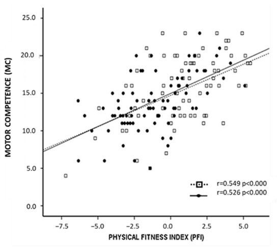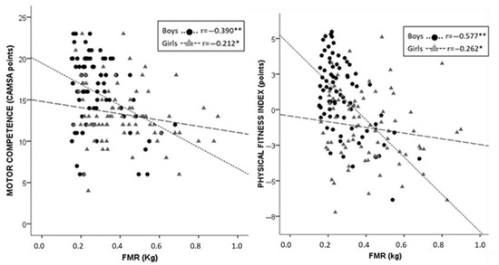Furthermore, Figure 2 shows that FMR is more strongly correlated with MC (r = −0.390, p < 0.01) and PFI (r = −0.577, p < 0.01) in boys than in girls. Therefore, the correlation between FMR and MC and PF is modulated by sex.