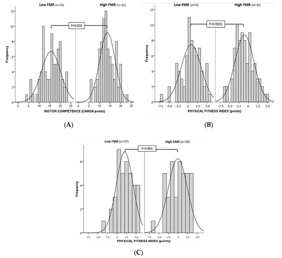 Histogram for (A) motor competence among FMRs for all children; (B) physical fitness among to FMRs for all children; (C) physical fitness among FMRs in boys. p values are from the t-test.
