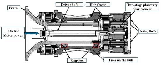 During normal vehicle operation, the hub motor serves as the driving component, rotating the drive shaft, which then transfers power to the first sun gear of the planetary gear system through its connection. The planetary gear system performs power transmission, achieving speed reduction and torque multiplication. The secondary planet carrier acts as the output of the planetary system, driving the hub frame and the wheels, thereby powering the entire vehicle.