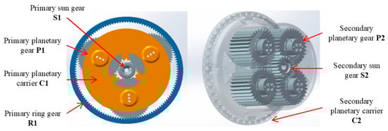 Difference in the degree of excitation impact: The primary reduction stage is directly exposed to the shock caused by the hub motor’s acceleration, while the secondary reduction stage experiences significantly reduced impact. First, the shock is attenuated by passing through the primary reducer. Second, the contact between the primary planetary carrier and the secondary sun gear’s internal and external ring gears provides additional damping. As a result, the shock from the motor’s acceleration undergoes two stages of isolation before reaching the secondary reducer, further reducing its intensity.