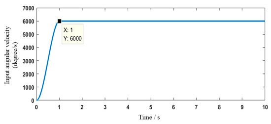 Motor Power Input: The motor serves as the driving force for this dynamic model. To ensure a smooth system startup, a step function (time, t0, x0, t1, x1) was used to model the motor input. This function defines the motor speed increasing linearly from x0 to x1 over the time interval from t0 to t1. Specifically, the input speed was as follows: step(time, 0, 0, 1, 6000 d). This represents the motor accelerating from 0 to 6000 degrees per second within 1 s, after which the speed remains constant. The input speed curve is shown in Figure 3.