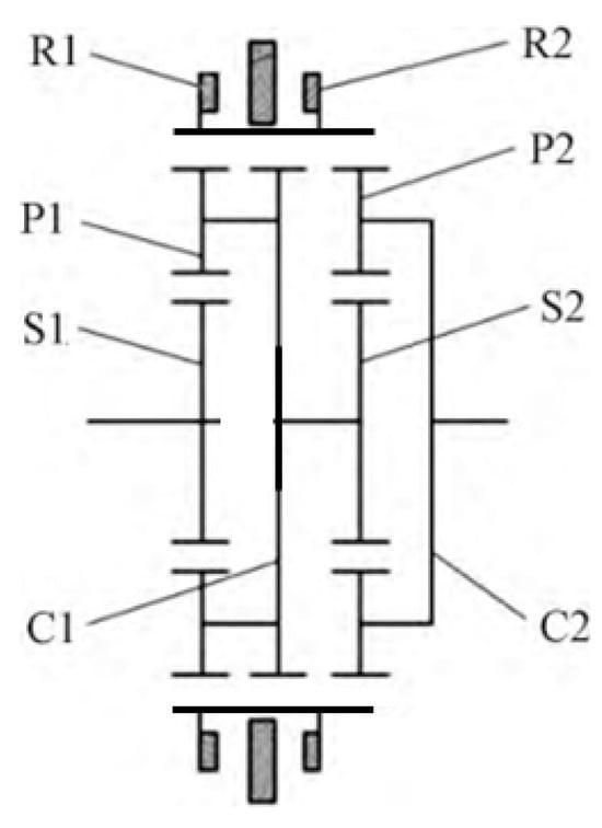 In a two-stage planetary gear reducer, achieving a stable transmission ratio is critical for both reducing speed while increasing torque and ensuring smooth operation. Figure 4 illustrates the transmission principle of the two-stage planetary gear reducer. Here, R1, P1, S1, and C1 represent the primary ring gear, primary planetary gear, primary sun gear, and primary planet carrier, respectively. Similarly, R2, P2, S2, and C2 represent the secondary ring gear, secondary planetary gear, secondary sun gear, and secondary planet carrier, respectively. From the transmission principal diagram, it is evident that the primary and secondary ring gears are fixed and connected to the ground. The primary sun gear meshes with the three primary planetary gears, transmitting power to the primary planet carrier. This carrier, in turn, engages with the secondary sun gear through internal and external ring gear meshing, transmitting power to the secondary planetary gears. Finally, the secondary planet carrier outputs the power. The transmission ratio can be calculated using Equations (1) and (2):