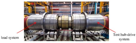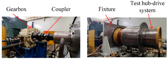 In mining dump trucks, the hub frame is attached to the vehicle’s chassis. Similarly, during the bench test, one side of the high-torque hub drive system was rigidly mounted to the test bench, while the other side was connected to a driving source. The driving source transferred power to the hub drive system through a transmission shaft coupled to the system’s drive shaft, replacing the motor used in real applications. Torque sensors were installed at the driving source to monitor torque variations during the experiment and control the output speed as input boundary conditions. Figure 5 shows the installation schematic for one side of the hub drive system.
