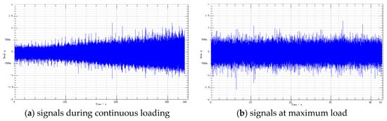 During the load test, the driving speed was maintained at 500 rpm while the load torque was gradually increased from 0 to 16,500 Nm. The vibration acceleration signals of the hub drive system were recorded throughout this process. The results are shown in Figure 8.