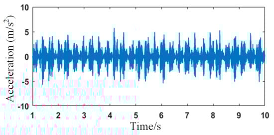 To validate the accuracy of the dynamic model, the load torque in the simulation was set to 16,500 Nm and the motor input speed was set to 500 rpm, matching the boundary conditions of the bench test. The contact stiffness, friction coefficients, and constraints defined earlier were maintained in the simulation. The radial vibration acceleration of the primary ring gear in the dynamic model was recorded, as shown in Figure 9.
