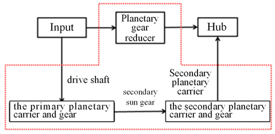 The motor drives the primary sun gear through the drive shaft, which transmits power to the primary planetary carrier and onward to the secondary sun gear. The secondary planetary carrier, which is rigidly connected to the wheel hub, outputs power to the wheel. The entire wheel hub system drives the vehicle, with four independently driven hub systems propelling the vehicle. The power transmission path is illustrated in Figure 10.