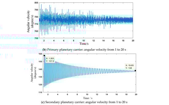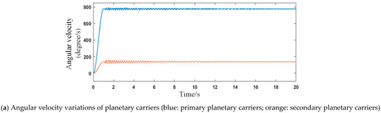 Moreover, from the responses of the planetary carriers’ angular velocities in Figure 11b,c after the hub motor input stabilized, it could be observed that the angular velocity amplitudes of both planetary carriers gradually decreased and eventually stabilized within a reasonable range of fluctuation. However, there was a noticeable difference: the fluctuations in the primary planetary carrier’s angular velocity appeared more irregular, while those of the secondary planetary carrier were smoother, following a harmonic decreasing pattern.