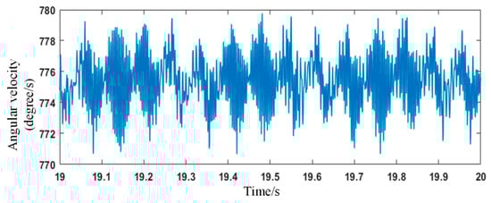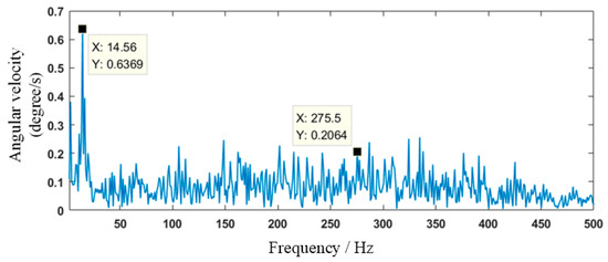 Comparing the time-domain angular velocity curve of the primary planetary carrier during the 19–20 s interval in Figure 12 with the frequency-domain curve in Figure 13, it can be observed that the primary planetary carrier’s angular velocity fluctuated within the range of 770–780 degrees per second, with a dominant frequency component of 14.56 Hz, which aligned with the primary sun gear’s rotational frequency. Moreover, aside from the low-frequency oscillations, high-frequency components are also clearly visible.