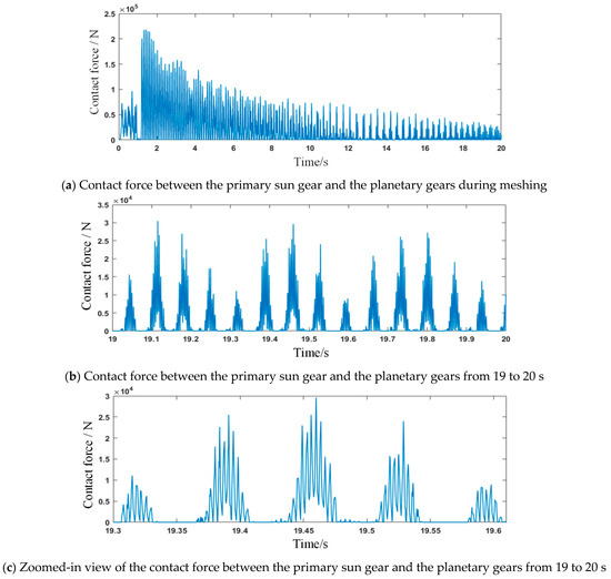 Figure 14 presents the contact force variation curve between the primary sun gear and the planetary gears. Subfigures (b) and (c) provide zoomed-in views of (a), showing finer details of the contact force variations. Similarly, Figure 15 illustrates the contact force variation curve between the secondary sun gear and the planetary gears, with subfigures (b) providing detailed views of the corresponding curves.