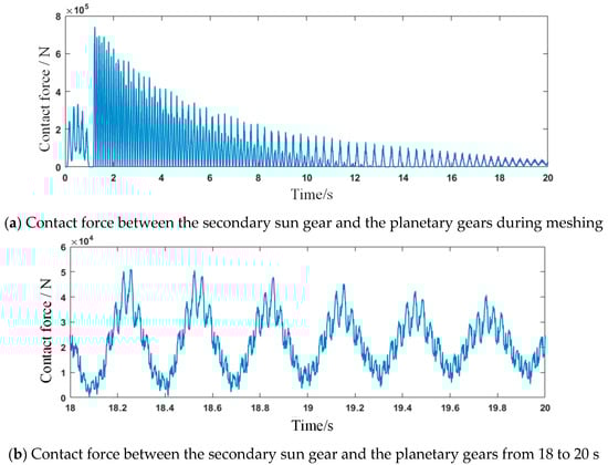 Given the initial inputs and boundary conditions, the overall dynamic characteristics of the wheel hub transmission reduction system were primarily focused on the system’s response to the input. Based on the system’s motion mechanism and the analysis of connection and contact methods, the system’s response to the hub motor input was reflected in two key aspects: the angular velocity output of the two-stage planetary gear system and the contact forces generated during gear meshing. While the previous section focused on the angular velocity output curves of the planetary carriers and their dynamic characteristics, this section provides a detailed discussion of the contact force variations during gear meshing.