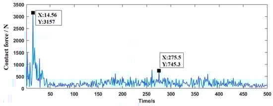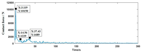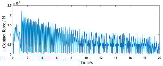 During the process described above, the contact force curve between the primary planetary carrier and the secondary sun gear is shown in Figure 16. The contact force fluctuated within a certain range, with the amplitude gradually decreasing until it stabilized. This curve indicates that the power transmission between the primary and secondary reducers is not an ideal linear relationship. It also confirms the earlier discussion regarding the influence of these contact force variations on the angular velocity output of the primary planetary carrier.