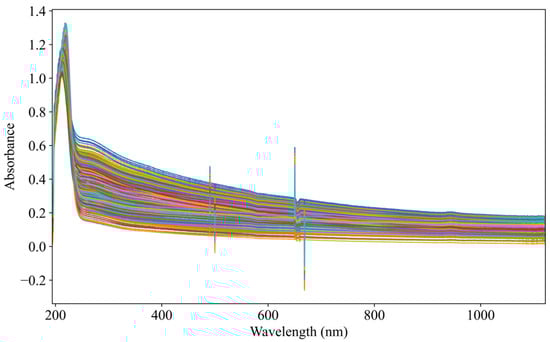 The UV-Vis spectrometer Cary 60 (Agilent, Santa Clara, CA, USA) was used to collect sample spectra, as shown in Figure 1. The spectrum range is from 193.91 nm to 1121.69 nm, with a resolution of 0.45 nm. The spectrometer is equipped with CaryWinUVV 5.0 (Agilent, Santa Clara, CA, USA) spectral acquisition software. The baseline correction is based on deionized water. The optical path length of the quartz cell is 10 mm. The integration time of the spectrometer is 10 ms. Each water sample was scanned 10 times in a row, and their average was noted. The original spectra of 240 collected water samples are shown in Figure 2.