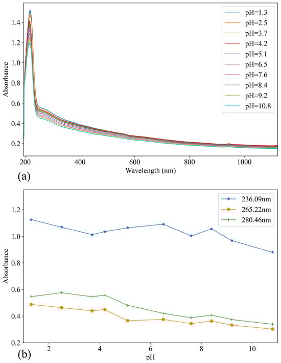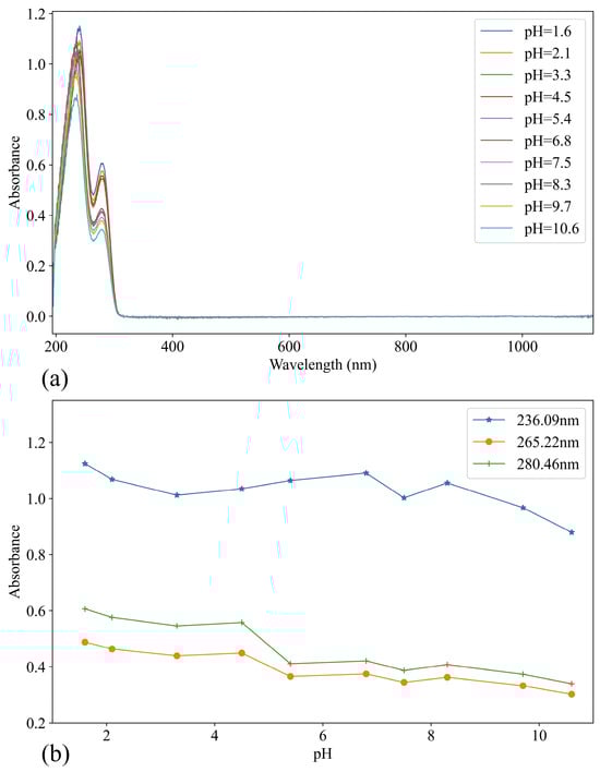 A 50 mg/L potassium hydrogen phthalate standard solution (COD standard solution) was prepared, exhibiting acidity with a pH of approximately four. To investigate the effect of pH, the pH of the standard solution was adjusted from 1.6 to 10.6 using an acid–base regulator. The UV-Vis spectra of these solutions are illustrated in Figure 3a. The absorbance curves at specific wavelengths (236.09 nm, 265.22 nm, and 280.46 nm) corresponding to the peaks and valleys in different pH ranges are illustrated in Figure 3b.